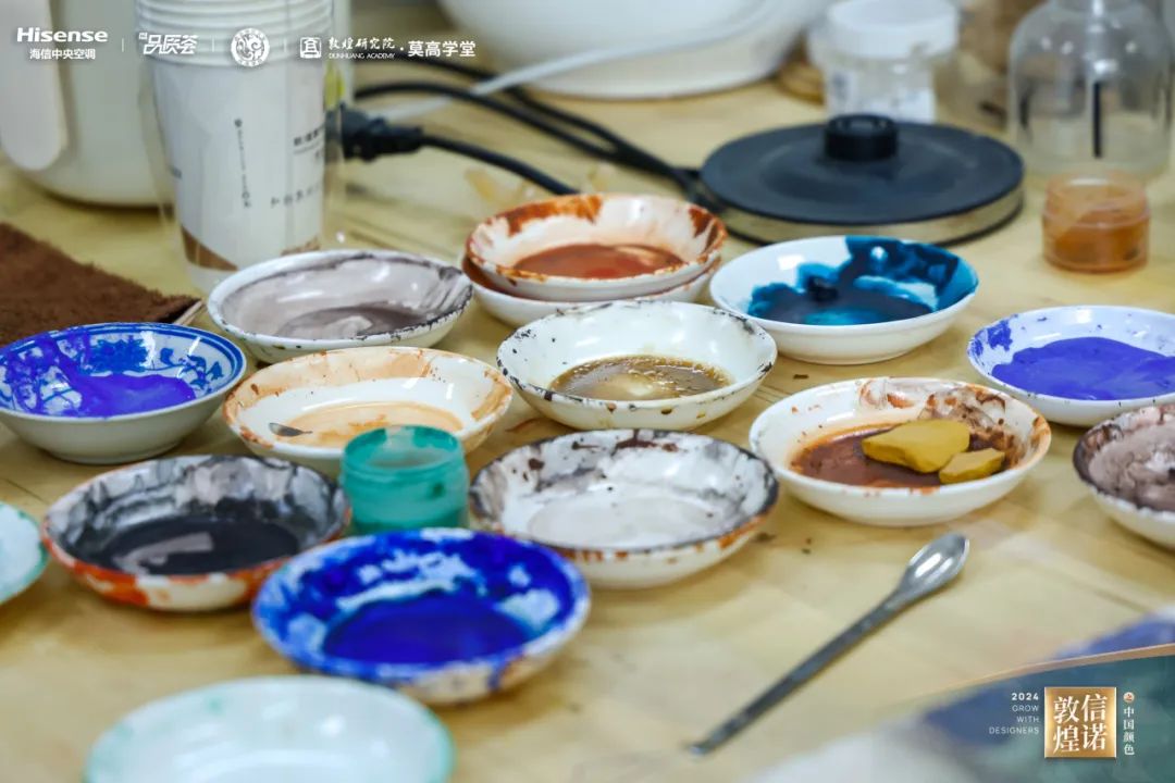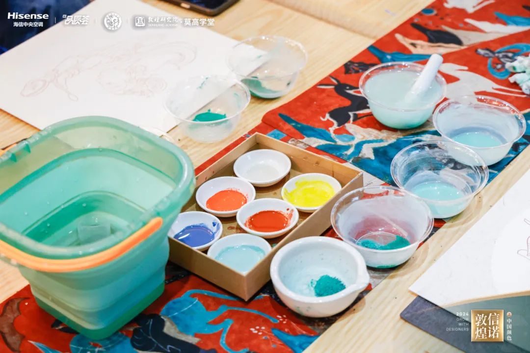 矿物颜料制作耗时之长、工序之繁,使敦煌壁画拥有历久弥新的色彩美感;石窟彩绘技艺之精、配色之妙,赋予了敦煌壁画千变万化的艺术魅力,历代工匠的心血与智慧深蕴其中。设计师们更在亲手体验颜彩的制作、壁画的绘画中,沉浸式领略敦煌千年“美色”的奇妙。