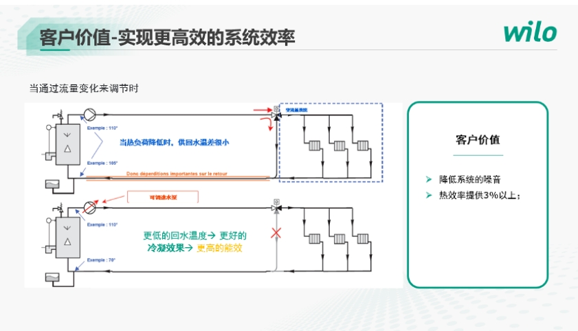 1变频泵可以用温差跟随的方式,得到更低的回水温度,让冷凝炉的效率更高。