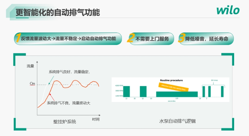 变频水泵还可实现自动排气功能,水泵本身可识别流量反馈信号,当检测到流量出现忽高忽低时,会判断得出系统里面有气,水泵就会开始执行自动排气的程序。会自动用15秒时间转到4200转的最大转速,