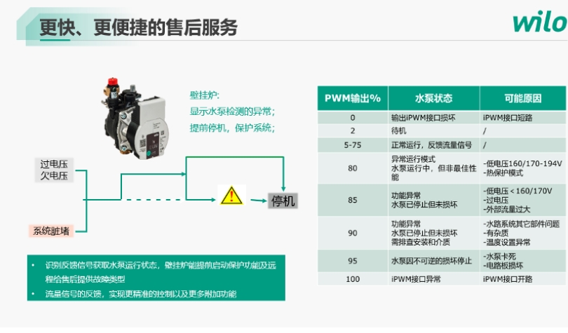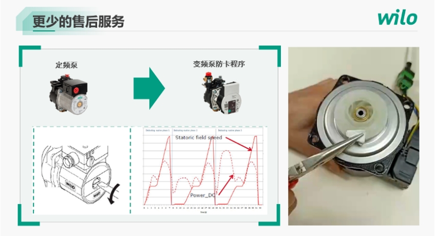 除了自动排气功能,大家也知道定速泵在市场上也遇到很多售后投诉的反馈,容易卡,容易堵转,这其中可能有水质原因以及水泵产品的原因,那变频泵是怎么去解决这个问题的呢?威乐在变频泵中特别设计