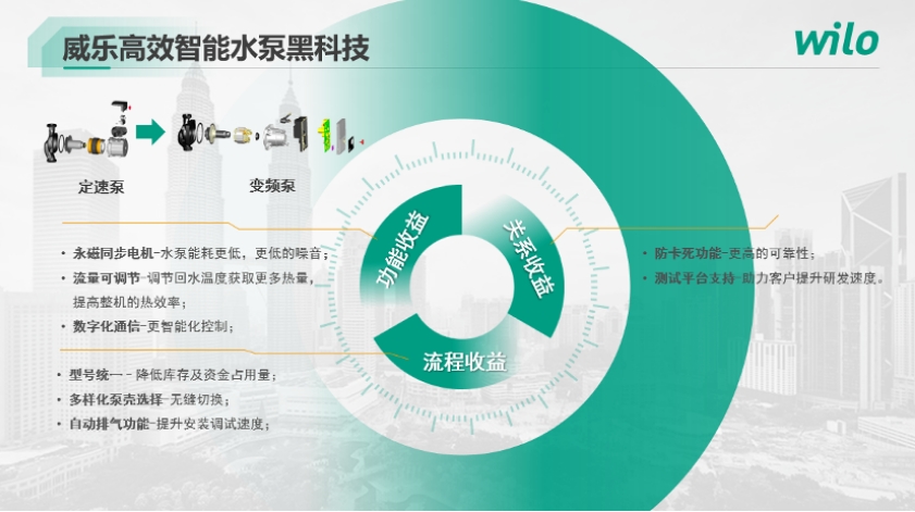 威乐的高效变频泵产品有小口径、大口径的不同配置,扬程从4米、6米、7米、8米、9米、10米、11米到更大,非常适合配套在壁挂炉和热泵系统中。