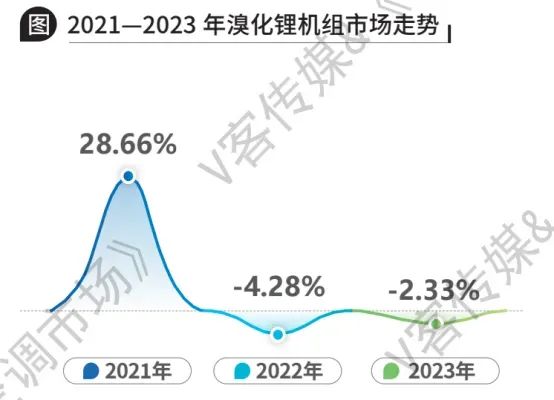 作为中央空调行业内的低碳节能典型代表,溴化锂机组具有无污染、节电等优势,在工业余热利用领域应用广泛。据V客传媒统计,2023年,在市场需求变化以及离心式热泵产品加速推广等多重因素的影响下,溴化锂市场整体规模较去年下滑2.33%。