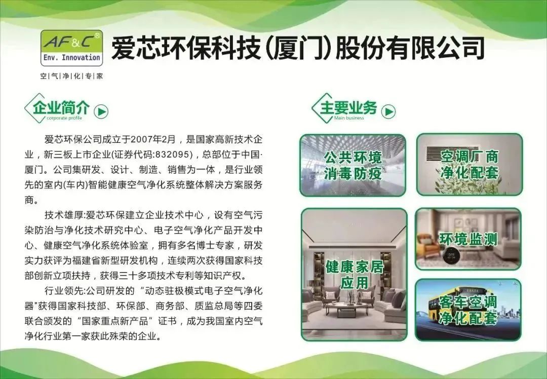 爱芯环保专注空气净化技术研发,向市场推广“动态驻极”静电除尘和纳米材料光催化、静电驻极、光电等离子等先进技术。公司主要产品有:模块式电子空气净化器(电子空气净化滤芯)、静电驻极净化消毒装置、空气净化自清洁智能机组和空气净化系统、5H健康空调系统、智慧新风净化系统、智慧院感系统、室内(车内)空气环境物联智控系统等空气质量整体解决方案的研发、生产、销售和技术服务。