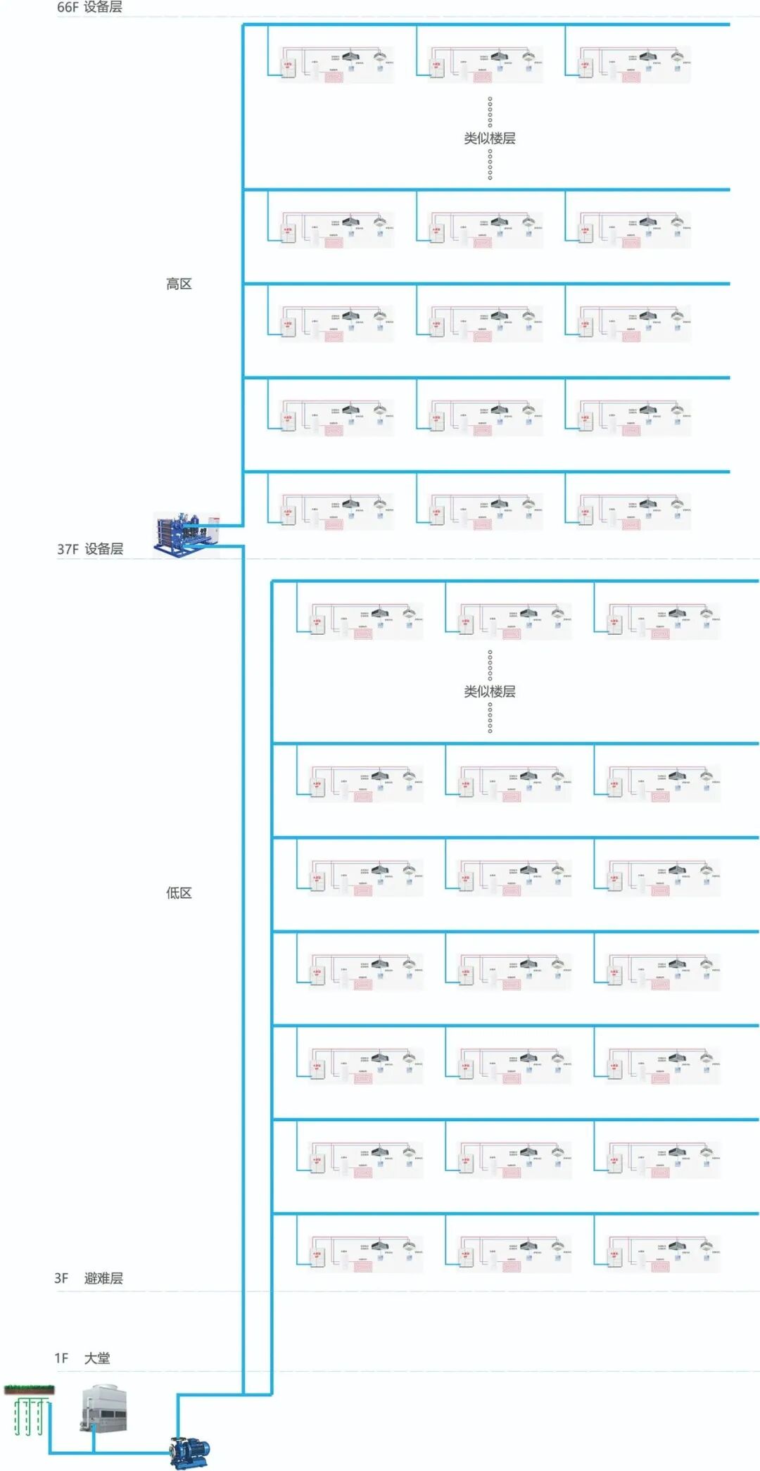 系统优化方面,日立变水流量水源变频多联机凭借2.5MPa的高承压能力,将水系统分区从常规多级简化为仅在172米处设置一次隔断,大幅简化系统结构,减少泵组配置,显著提升运行能效。通过全生命周期成本分析,设计采用土壤源耦合闭式冷却塔承担系统夏季与冬季负荷,并完全替代燃气热水锅炉,大大降低了物业运行能源费用,使项目在节能与运营层面均具备可持续性,深度契合项目对绿建二星、LEED金级与WELL金级认证的追求。