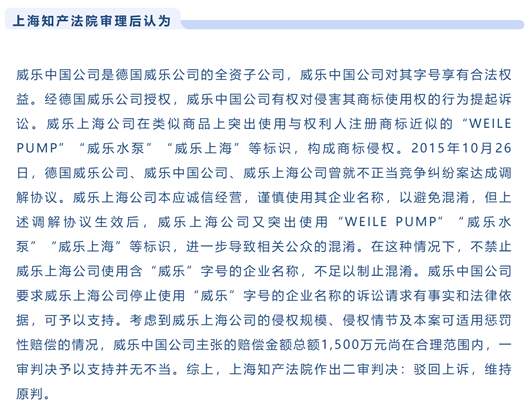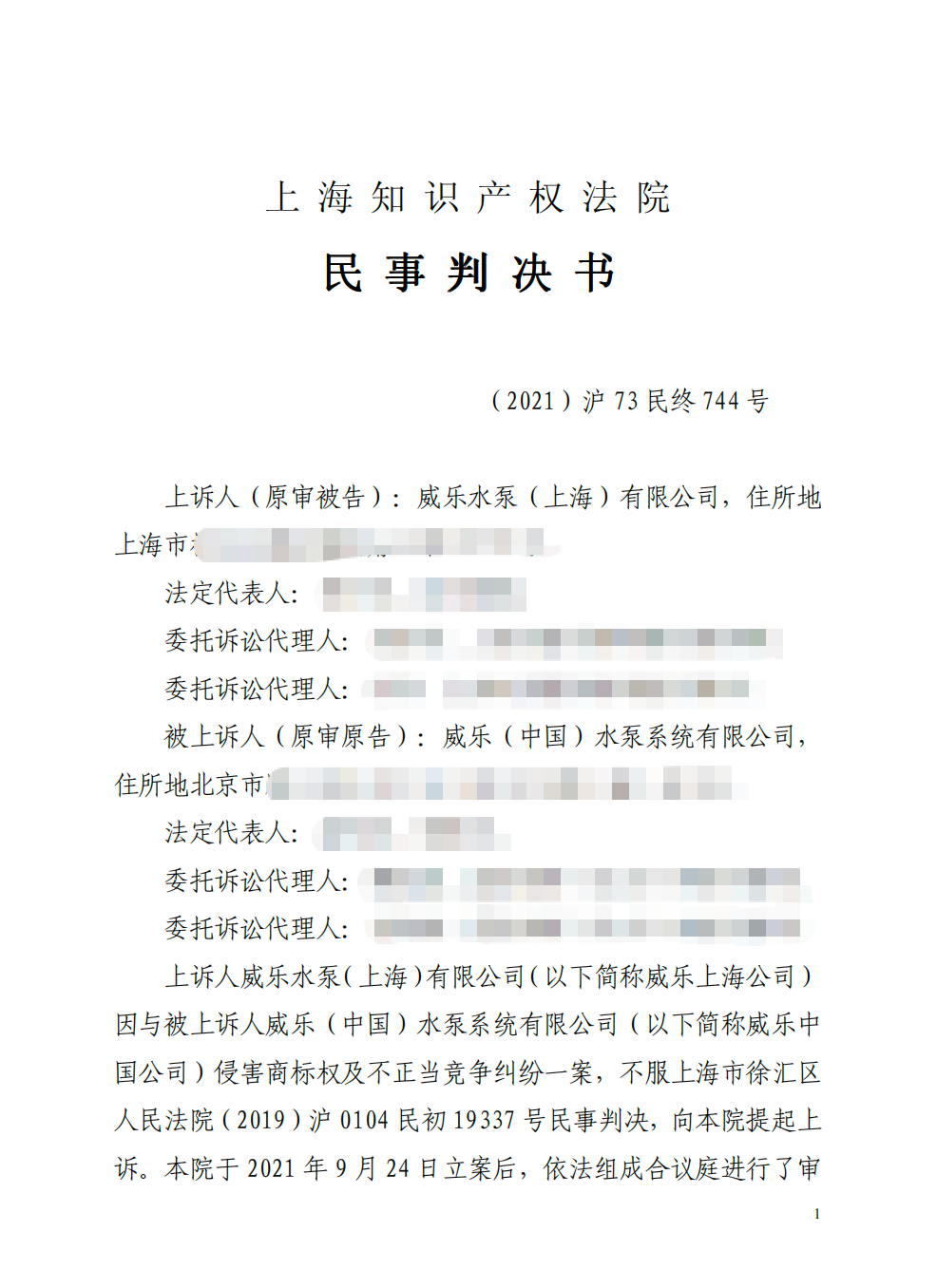 在守护知识产权的道路上,威乐中国始终坚持“对侵权行为零容忍”的态度。作为德国威乐的全资子公司,威乐中国是“威乐”“WILO”商标的合法持有者和使用者。此前,针对威乐水泵(上海)有限公司的商标侵权及不正当竞争行为,威乐中国通过法律途径坚决维权。法院最终判令对方停止侵权、变更企业名称,并赔偿经济损失及合理费用1510万元,这一判决不仅为威乐中国挽回了经济损失,更彰显了国家保护知识产权的坚定决心,同时也成为了上海知识产权法院适用惩罚性赔偿的典型案例。此外威乐中国在多起同类知识产权诉讼中均胜诉,有利捍卫了创新成果,并为行业树立了知识产权保护标杆。