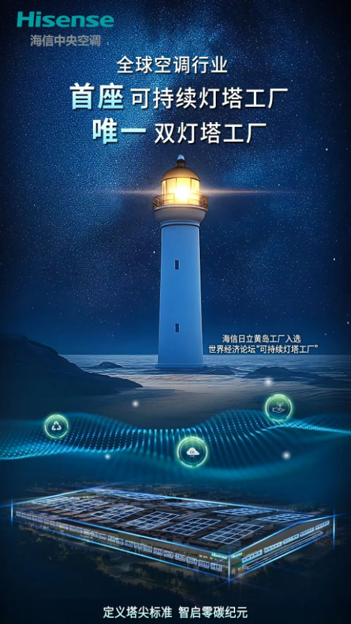 2025年9月16日,世界经济论坛(WEF)正式宣布,海信日立黄岛工厂成功入选全球“可持续灯塔工厂”名单,成为全球空调行业首座“可持续灯塔工厂”。继去年获评全球“灯塔工厂”后,海信日立黄岛工厂完成新跨越,成为全球唯一的空调行业“双灯塔工厂”,以塔尖之光照亮绿色智造发展路径。
